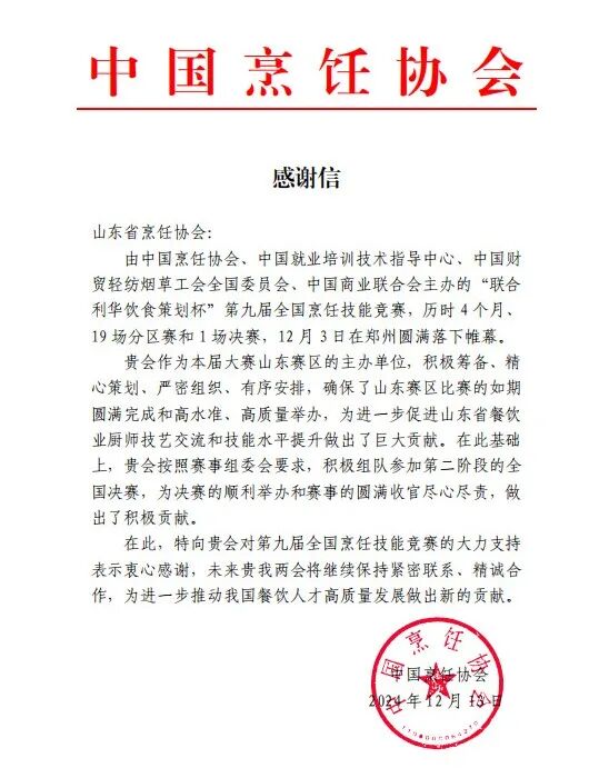 中国烹饪协会特向山东省烹饪协会发来感谢信